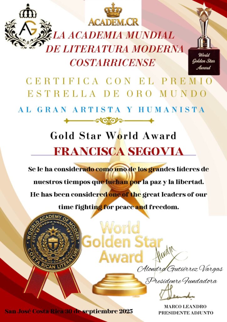 Francisca Segovia recibe el Premio Estrella de Oro Mundo de la Academia Mundial de Literatura Moderna octubre 1, 2025