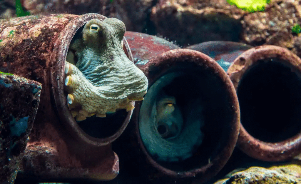 El arsenal del pulpo se completa con las papilas, unas pequeñas protuberancias musculares que le permiten cambiar la textura de su piel, imitando corales, rocas o arena, añadiendo una dimensión tridimensional a su engaño visual.